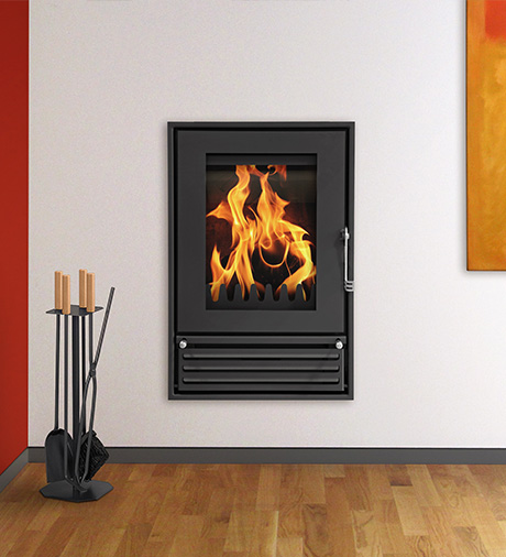 Schmitzker Nº 5: Großzügiger Brennraum mit eleganter Scheibe für ein ausdrucksstarkes Flammenbild. Hoher Qualitätsanspruch und einfache Handhabung zeichnen diesen Kamineinsatz aus.