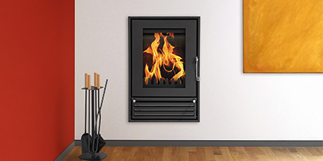 Schmitzker Nº 5: Großzügiger Brennraum mit eleganter Scheibe für ein ausdrucksstarkes Flammenbild. Hoher Qualitätsanspruch und einfache Handhabung zeichnen diesen Kamineinsatz aus.