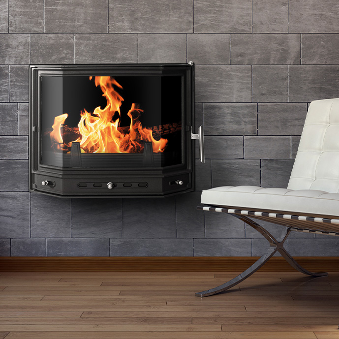 Schmitzker Nº 2: Wasserführender Eckkamin mit klaren Linien und modernem Design. Verfügbar mit Fenster links oder rechts, inklusive Blendrahmen für einfache Montage. Die großzügige Eckscheibe betont das Flammenspiel.