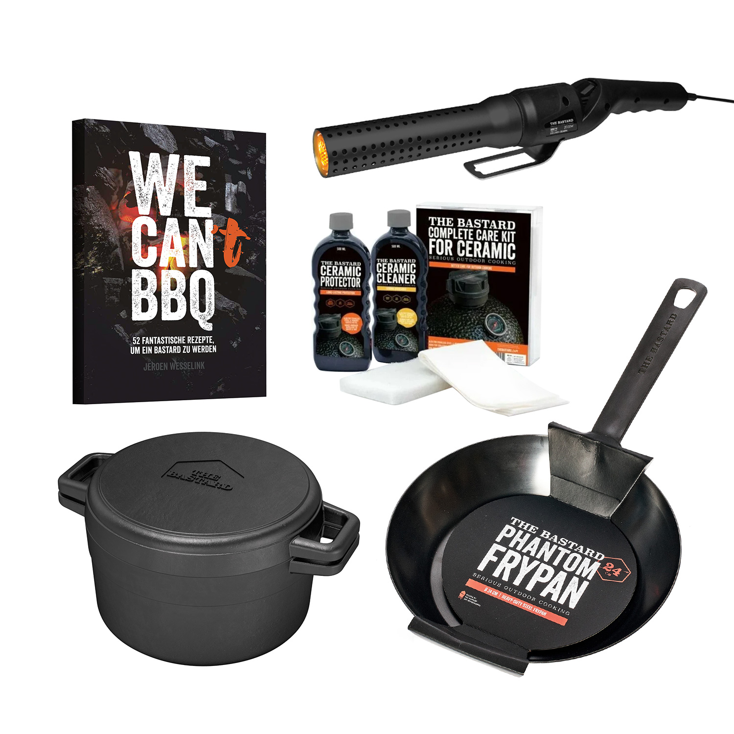 The Bastard Large Complete ist der Bestseller des gleichnamigen Herstellers The Bastard aus den Niederlanden. Seine perfekte Größe für 2 bis 8 Personen macht diesen Keramikgrill unglaublich vielfältig in seinen Einsatzmöglichkeiten. Der zweigeteilte, halbmondförmige Deflektor ermöglicht sowohl das direkte als auch das indirekte Grillen. Über das Präzisionsrad auf der Kuppel steuerst du die Luftzufuhr und damit die Gartemperatur im Grill. Dank der Infinity-Dichtung wird die Wärme optimal im Grill gehalten, ohne zu entweichen. Die beiden klappbaren Seitenteile von The Bastard Large Complete bieten ausreichend Platz zum Abstellen von Grillzubehör. Und damit der Kamado immer dort steht, wo du grillen möchtest, ist das Heavy Duty Gestell mit vier Rädern ausgestattet. Das Large Complete Modell punktet zudem mit einer klassischen glänzenden Oberfläche. Über das Varianten-Menü kannst du diesen Grill aber auch mit einer matten Oberfläche auswählen.